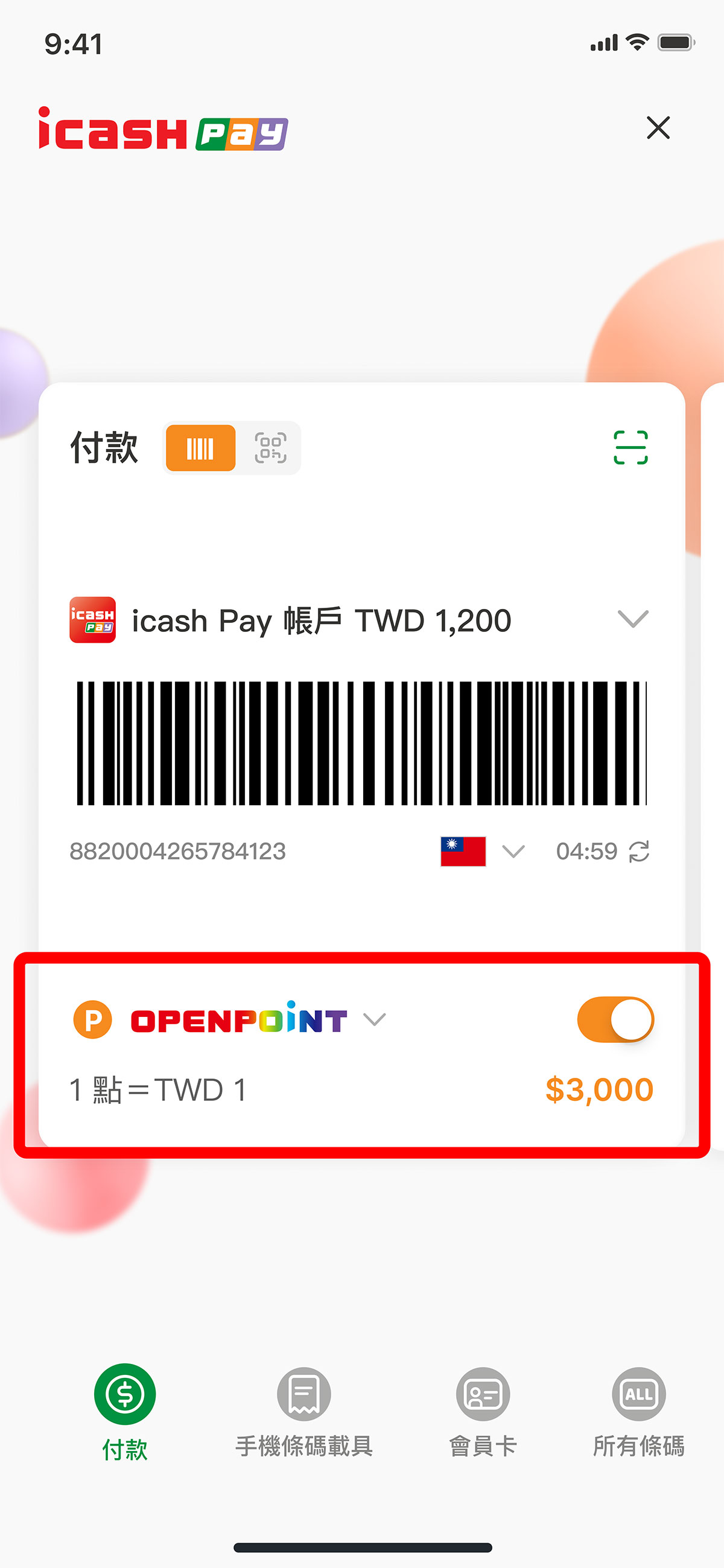 APP首頁點擊「付款碼」後,把OPEN POINT開關打開,即可折抵。