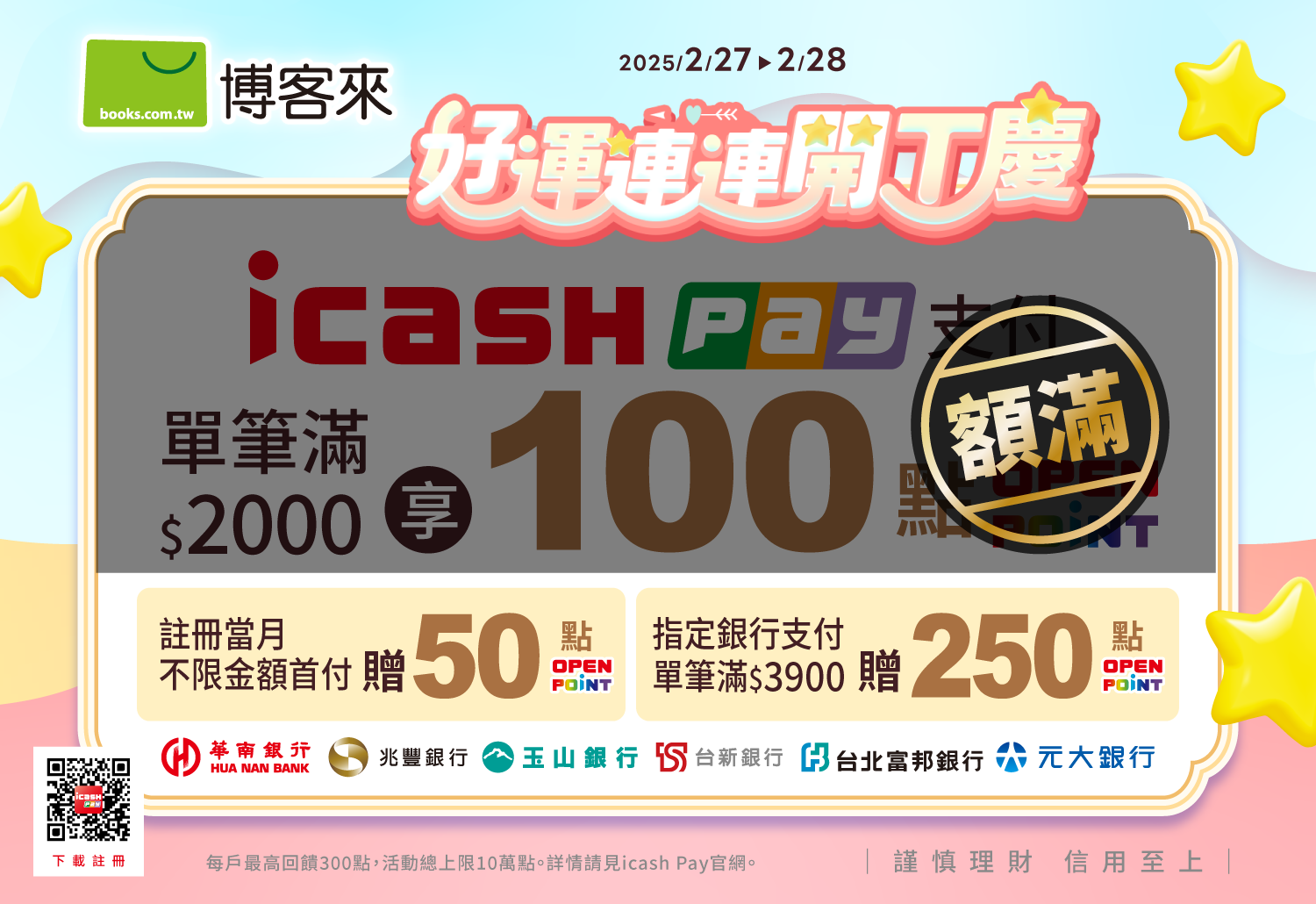 活動期間內首次註冊icash Pay之新用戶,註冊當月使用icash Pay不限金額消費,即贈50點OPENPOINT。每戶限回饋乙次,活動總上限270萬點。活動詳情。