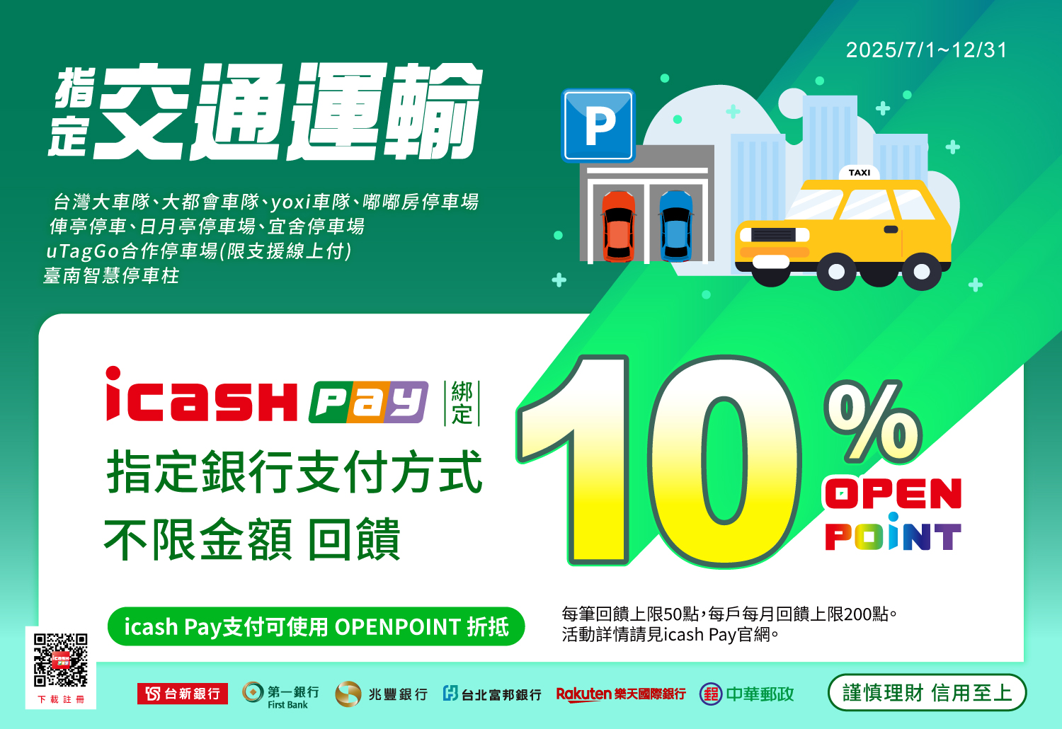 - 本活動需以下列支付方式進行交易:(1) icash Pay綁定指定銀行指定卡付款、(2) icash Pay連結指定銀行存款帳戶直扣付款(以銀行帳戶儲值、自動加值至icash Pay不適用本活動),方可獲得OPENPOINT加贈點數,部份或缺額支付、條件不符者恕不加贈。