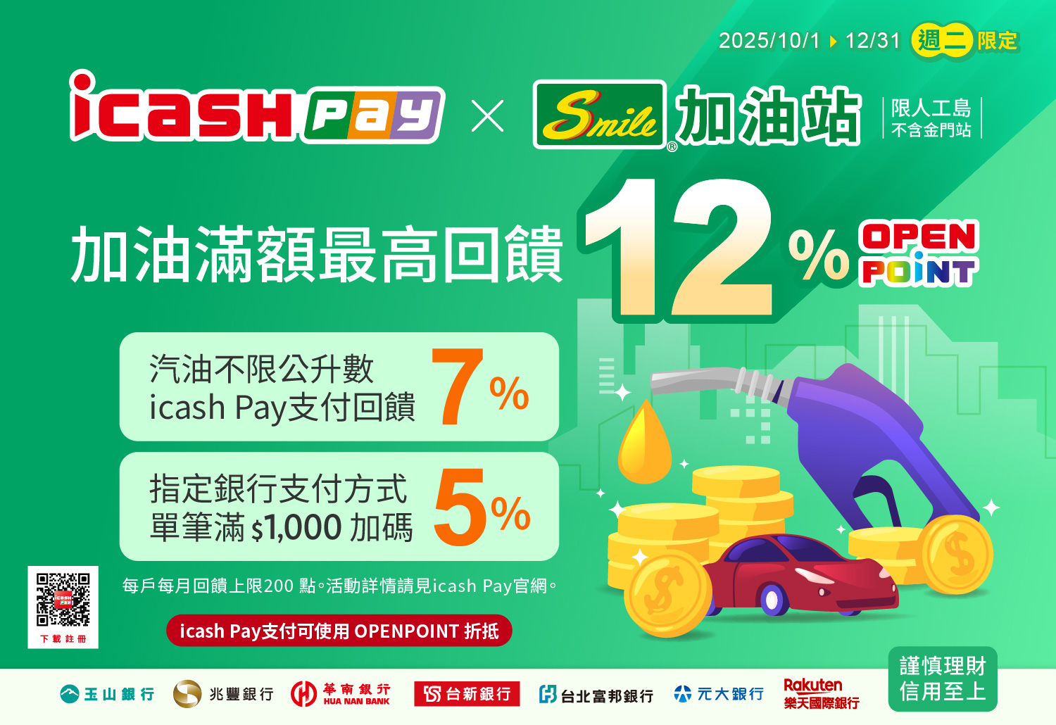 - 金門站不配合本活動,本活動適用之加油站點需具接受icash Pay之設備,並依業者現場公告為準;倘收銀設備故障或系統線路問題無法連線,恕無法提供本活動贈送之OPENPOINT點數。