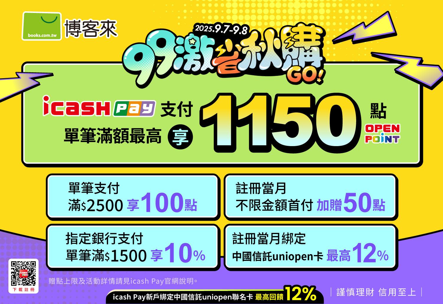 活動期間內首次註冊icash Pay之新用戶,註冊當月使用icash Pay不限金額消費,即贈50點OPENPOINT。每戶限回饋乙次,活動總上限200萬點。活動詳情。