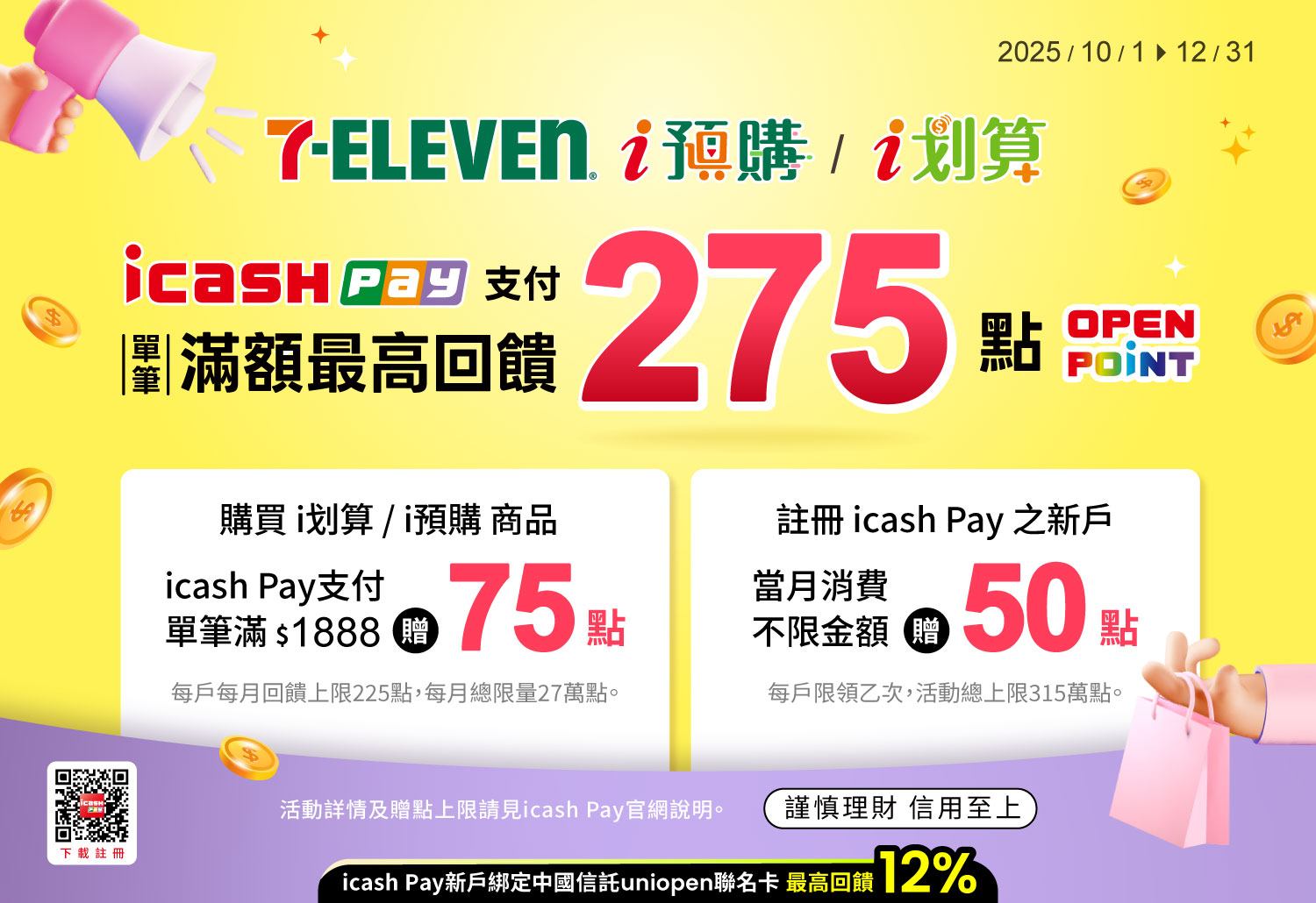 活動期間凡於7-ELEVEN「i預購」及OPENPOINT APP內「i划算」線上支付使用icash Pay支付單筆消費金額1,888元以上(含),即可享75點OPENPOINT點數回饋,單筆限一次,不累贈。活動期間每戶每月回饋上限225點,每月總回饋上限27萬點,送完為止)