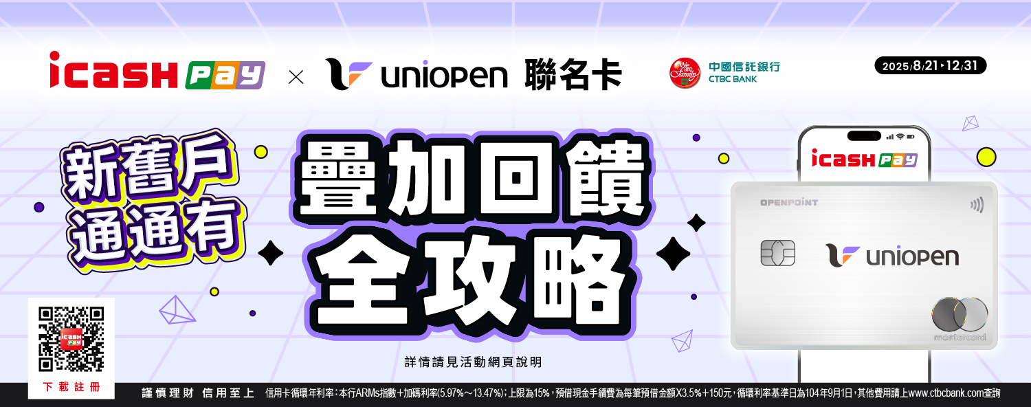 • uniopen聯名卡最高回饋7%(適用綁定icash Pay) 活動詳情