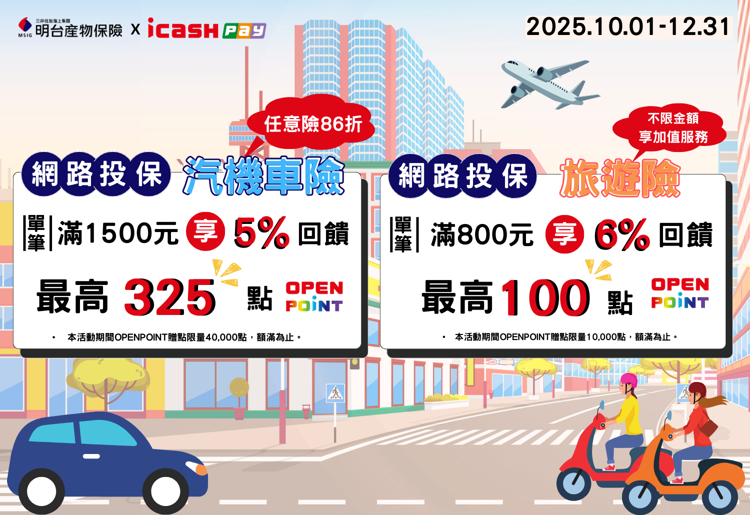\icash Pay限時回饋大方送/ 網路投保明台產險指定險種,立即享OPENPOINT回饋!