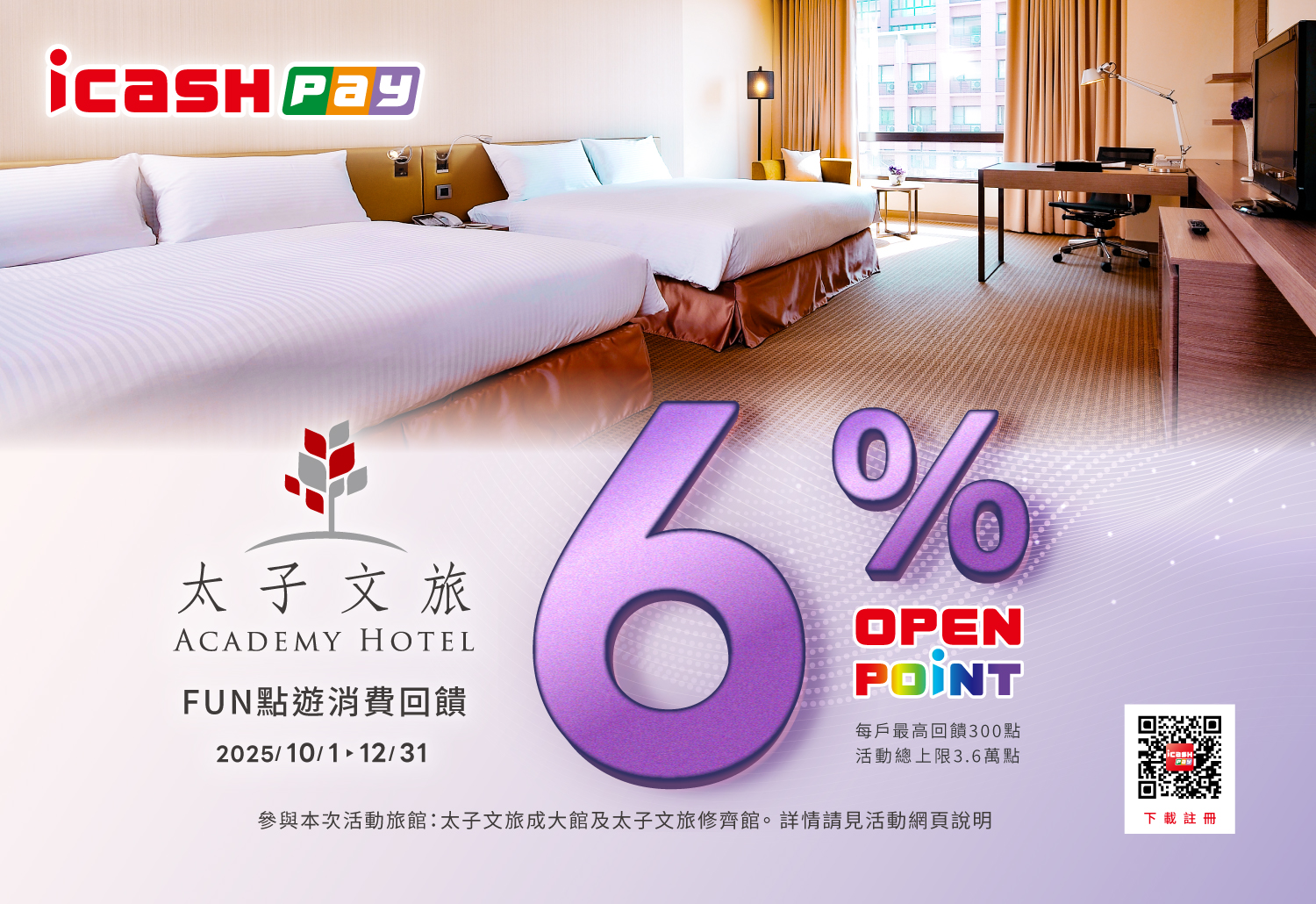 活動方式:活動期間於以icash Pay於太子文旅飯店支付住房費或館內消費,即贈支付金額6%OPENPOINT。(活動期間每戶回饋上限300點,總活動回饋點數上限3.6萬點)