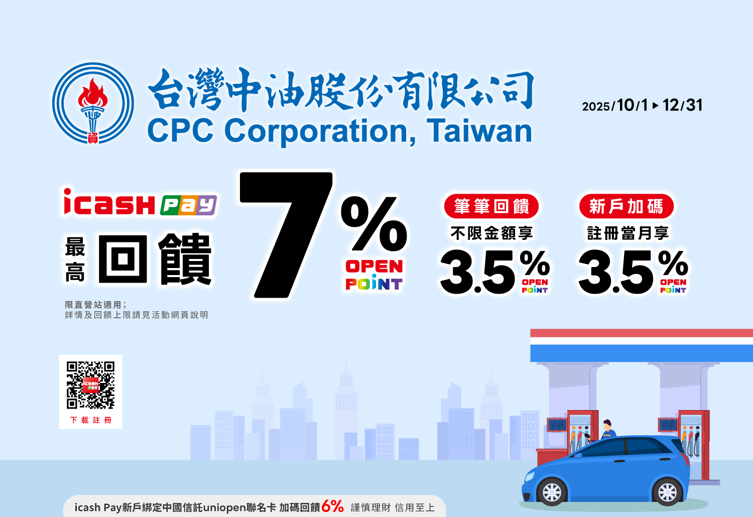 【新戶加碼回饋3.5%】首次註冊icash Pay之新用戶,註冊當月使用icash Pay於中油加油站直營站使用icash Pay支付不限金額加碼享3.5% OPENPOINT回饋。每月每戶回饋上限200點OPENPOINT,活動期間總贈點上限20萬點OPENPOINT。