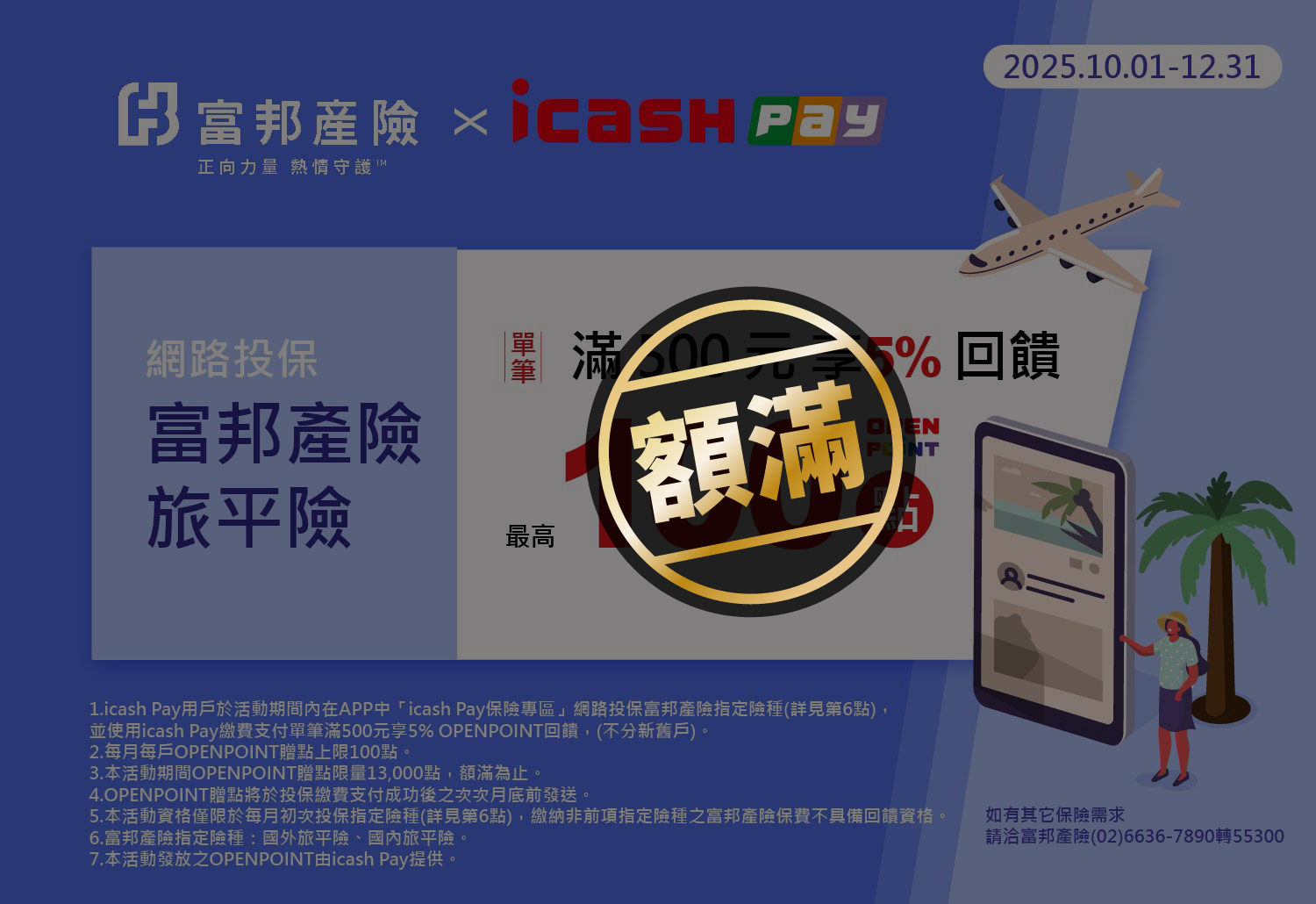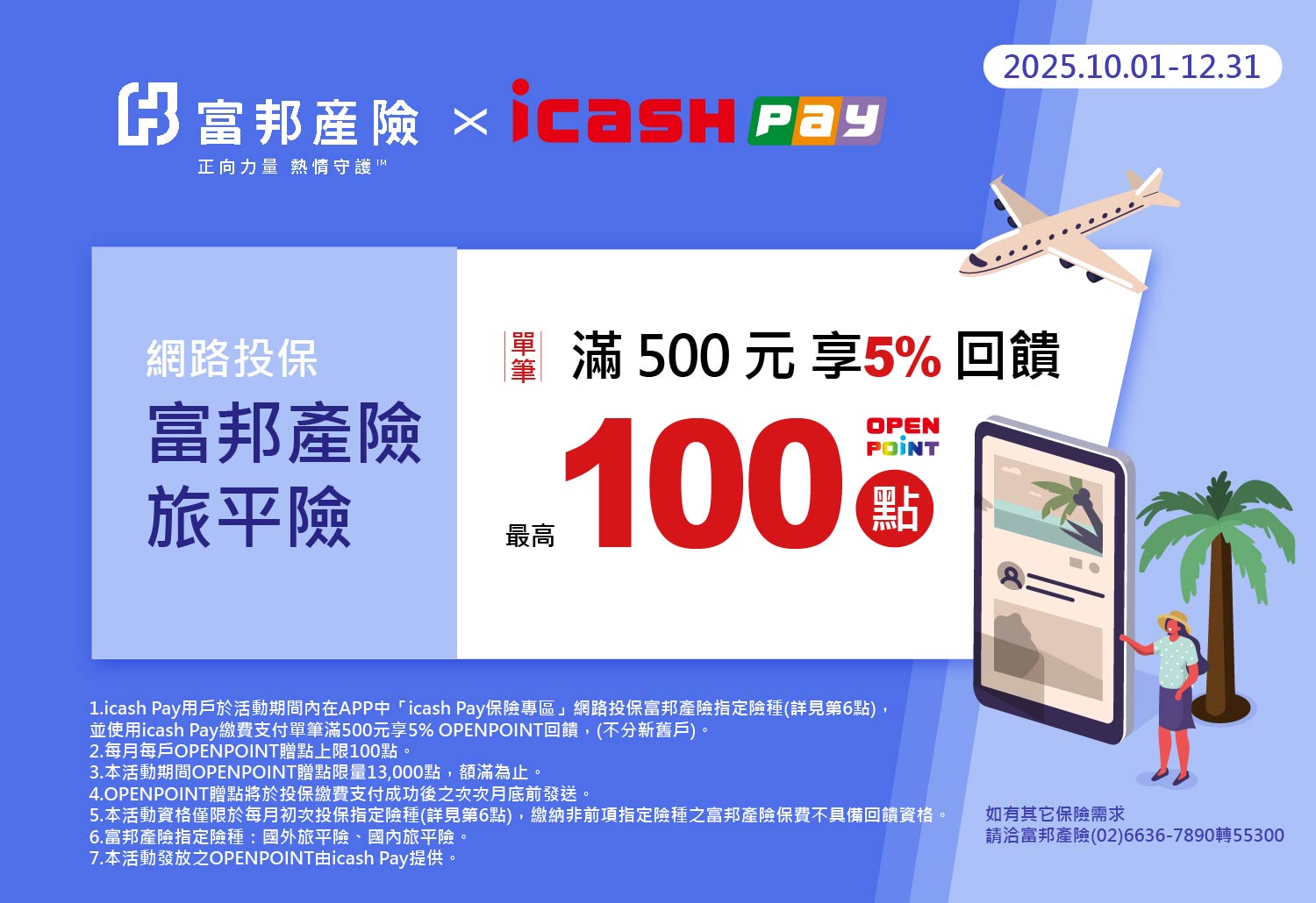 - icash Pay用戶於活動期間內在APP中「icash Pay保險專區」網路投保富邦產險指定險種(詳見第6點),並使用icash Pay繳費支付單筆滿500元享5% OPENPOINT回饋,(不分新舊戶)。