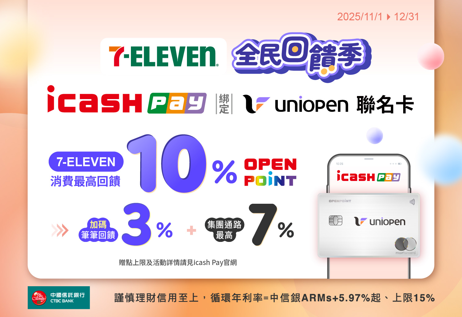 普發現金,全民回饋季!icash Pay綁定uniopen聯名卡 7-ELEVEN最高回饋10%