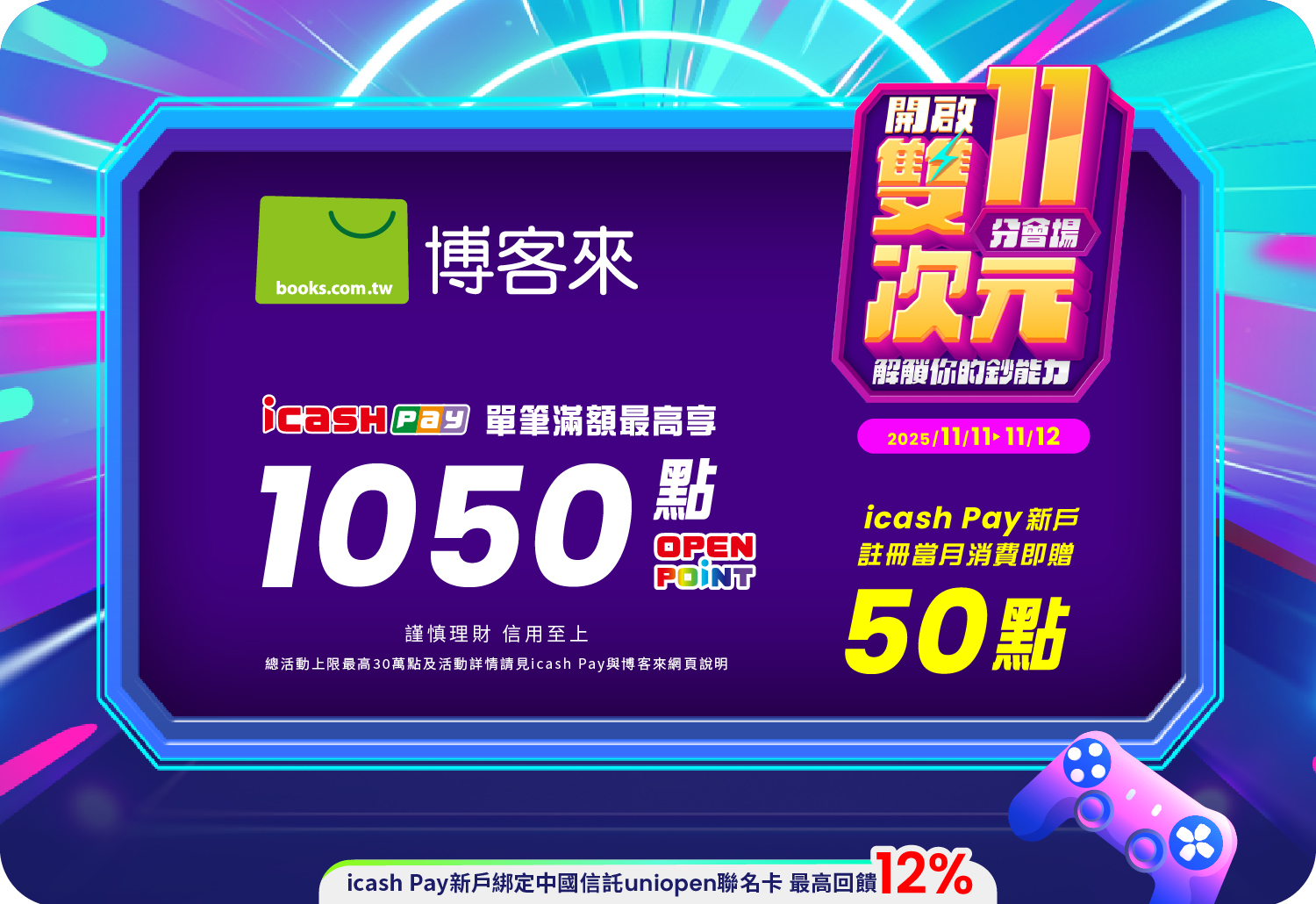 【新戶加碼】活動期間內首次註冊icash Pay之新用戶,註冊當月使用icash Pay不限金額消費,即贈50點OPENPOINT。每戶限回饋乙次,活動總上限315萬點。活動詳情。
