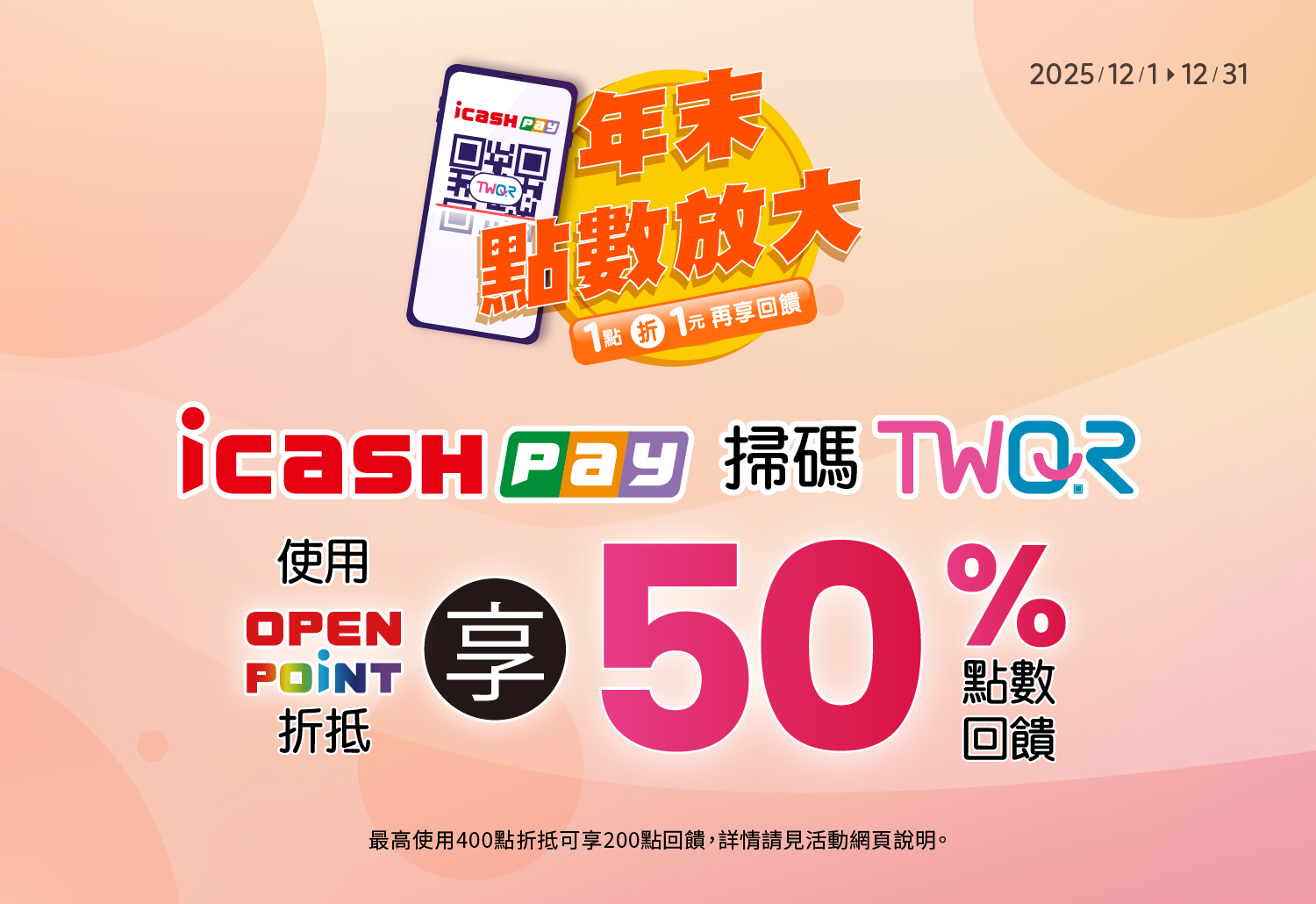 活動期間於全台標示TWQR店家,以icash Pay掃描TWQR之QR Code並使用點數折抵付款,每折抵1點OPENPOINT,享折抵金額50%點數回饋,每戶最高回饋上限200點,活動回饋總上限40萬點。