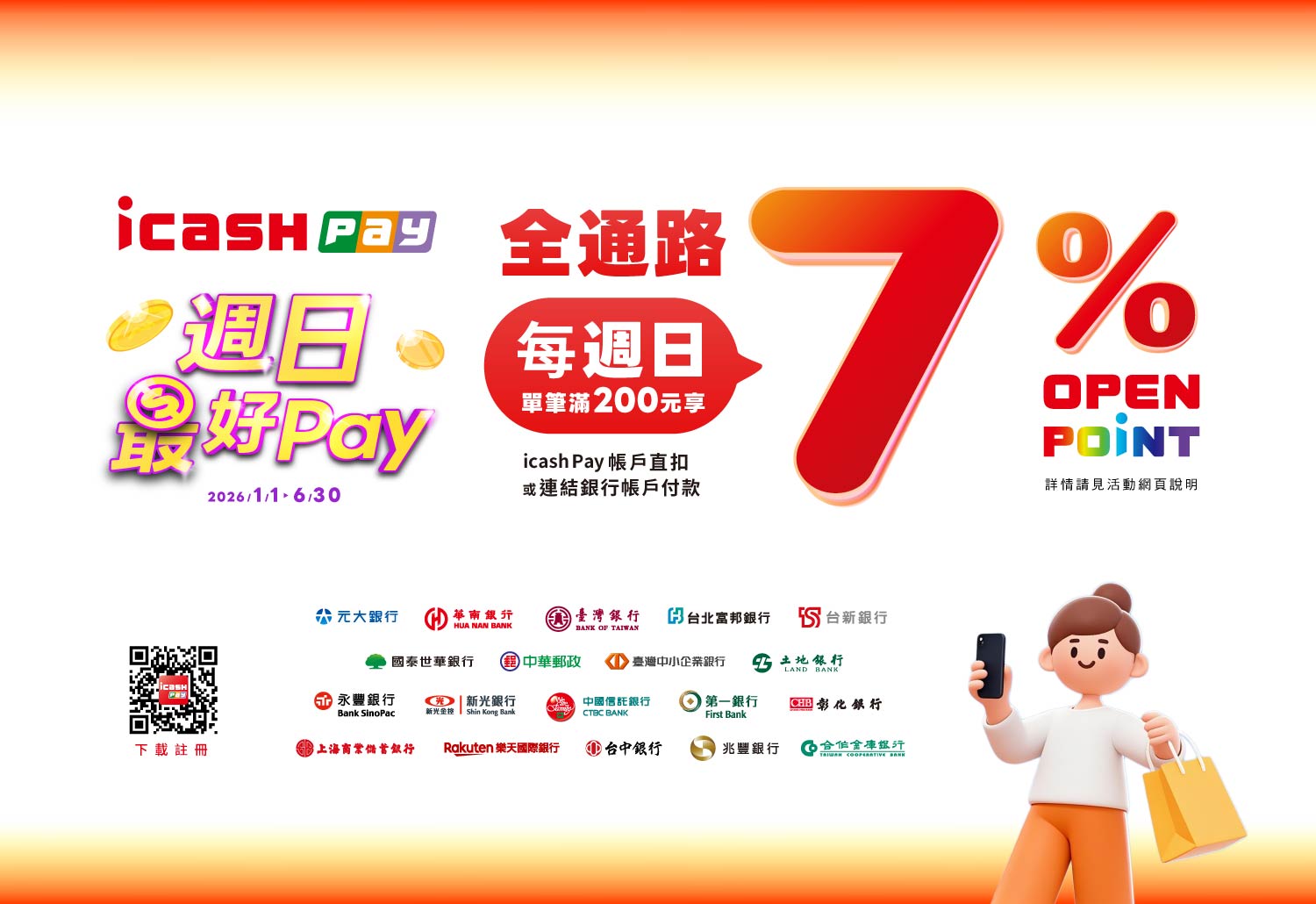 【週日全通路消費滿額回饋7%】活動期間每週日使用icash Pay於全通路消費(限icash Pay帳戶餘額、連結銀行帳戶付款)單筆滿200元(含),享交易金額之7% OPENPOINT回饋,活動期間每月/戶回饋上限200點OPENPOINT,活動期間每月總贈點上限100萬點。