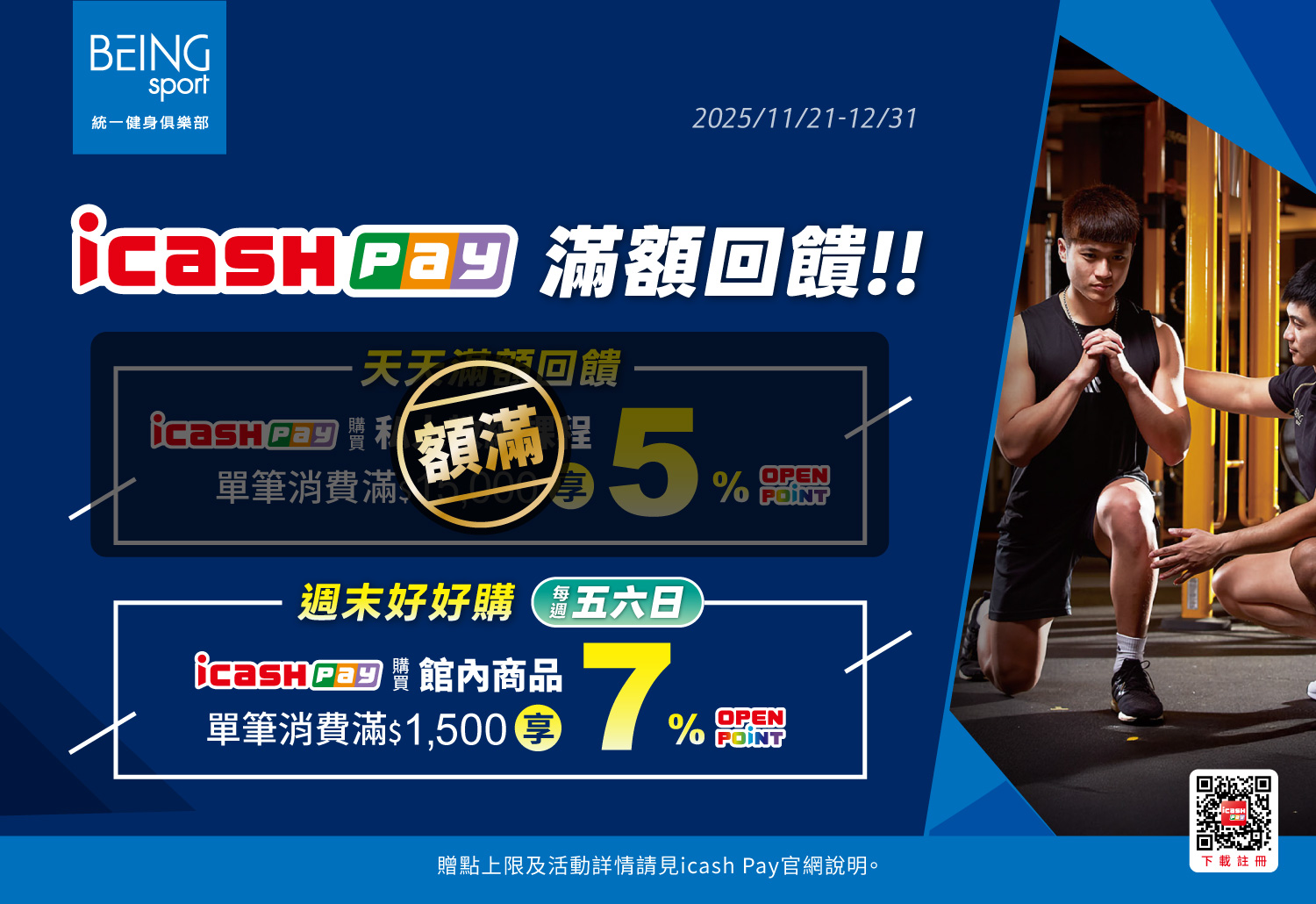 活動期間每週五六日使用icash Pay於全台BEING sport門市指定館內商品單筆滿1,500元(含)以上,享交易金額之7% OPENPOINT回饋,活動期間每戶回饋上限1,000點,11月總贈點上限5萬點,12月總贈點上限10萬點。