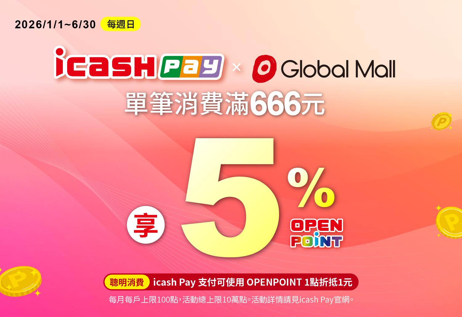活動期間每週日持icash Pay於環球購物中心單筆消費滿666元(含)以上,享交易金額之5% OPENPOINT回饋,活動期間每月每戶回饋上限100點OPENPOINT,活動總上限10萬點OPENPOINT。