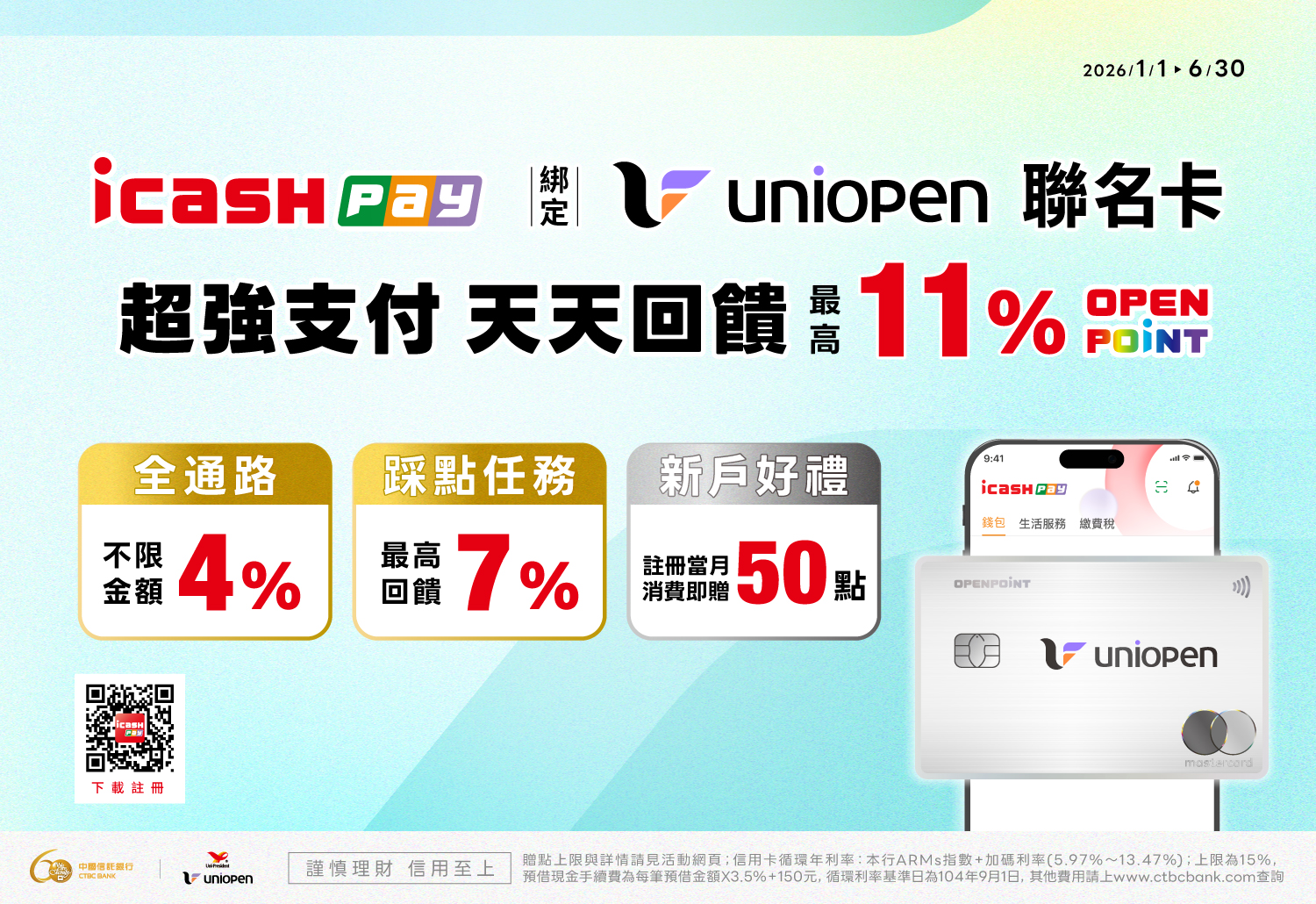 icash Pay超強支付 綁uniopen聯名卡天天最高11%