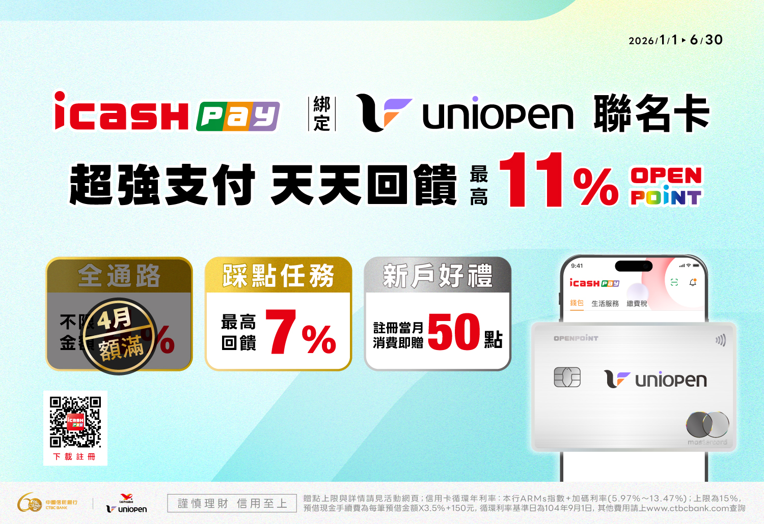icash Pay超強支付 綁uniopen聯名卡天天最高11%