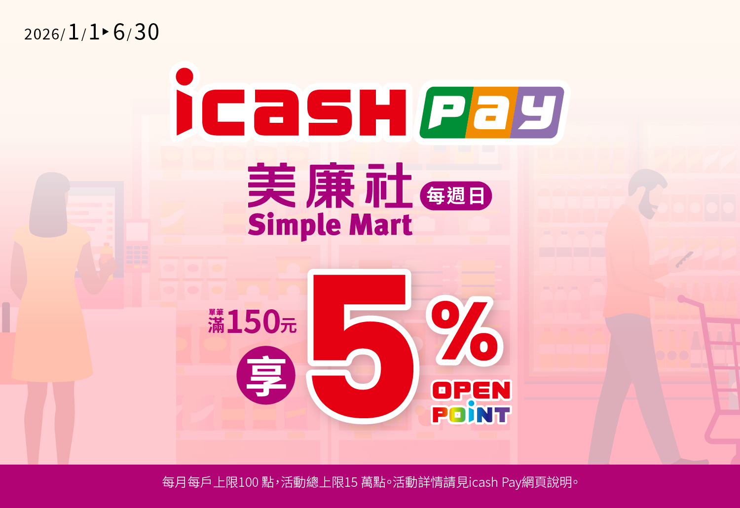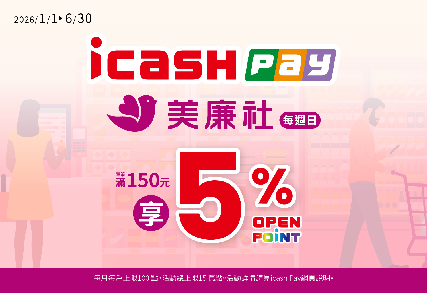活動期間每週日持icash Pay於美廉社(含心樸市集)單筆消費滿150元(含)以上,享交易金額之5% OPENPOINT回饋,活動期間每月每戶回饋上限100點OPENPOINT,活動總上限15萬點OPENPOINT。