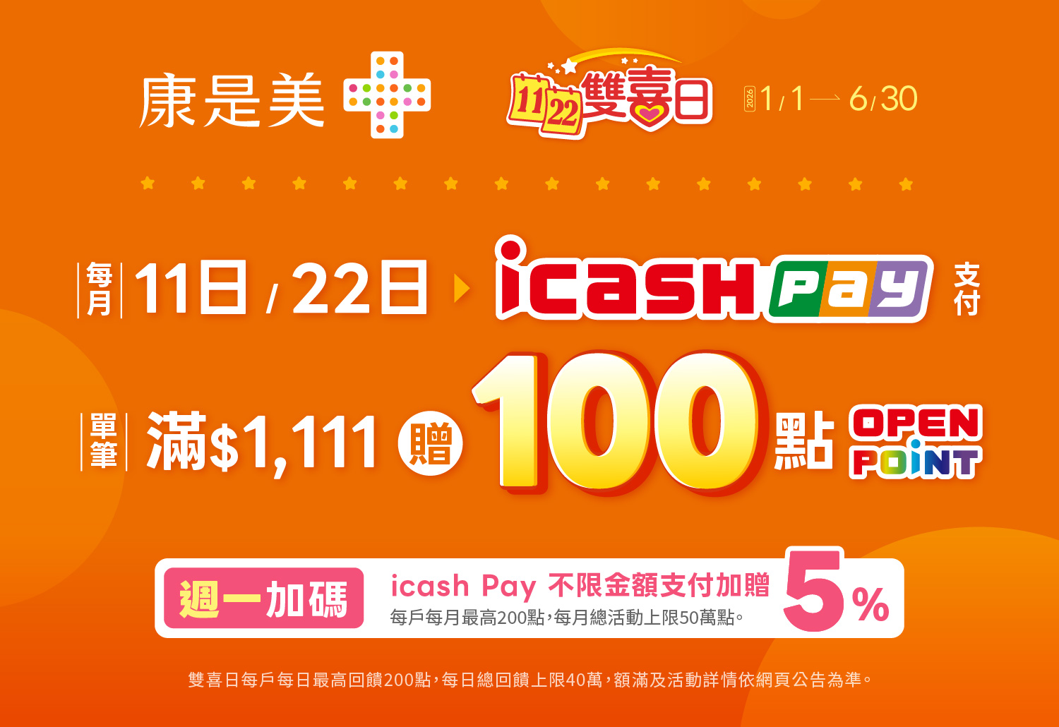 活動期間每月11、22日於康是美實體門市以icash Pay支付單筆消費折扣後滿1,111元,即可享100點OPENPOINT點數回饋,每戶每日回饋上限200點,活動期間每日總回饋上限40萬點。