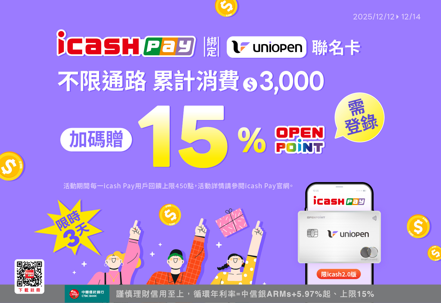 以icash Pay綁定中信uniopen聯名卡(icash2.0版)支付,不限通路累計消費3,000元(含)以上,加碼贈15% OPENPOINT回饋,每一icash Pay用戶回饋上限450點。(需登錄,登錄限量1350名,額滿為止)