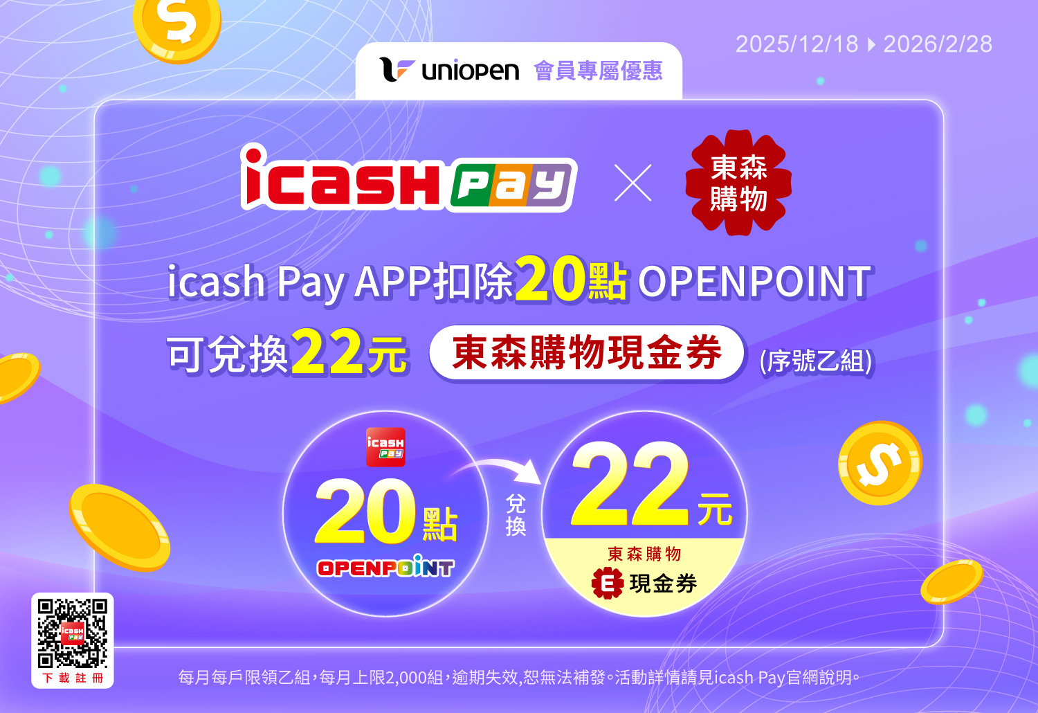 活動期間內至icash Pay APP成功扣除20點OPENPOINT,即可兌換【22元東森購物現金券】序號乙組