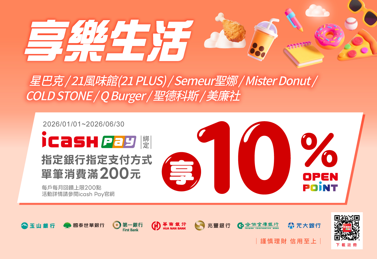 - 玉山銀行:指定icash聯名卡適用(限正卡,不含玉山Unicard、玉山U Bear信用卡、玉山熊本熊聯名卡),每月登錄限量 5,000名。活動登錄時間:當月15日早上10:00:00至當月最後一日23:59:59止,統一開放正卡人於玉山銀行官網登錄,額滿為止。《立即登錄》