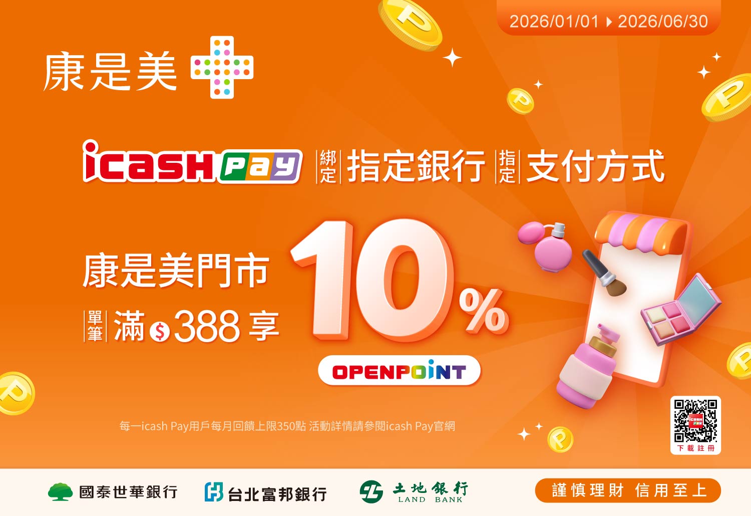 活動內容:以指定銀行指定支付方式於康是美實體門市單筆消費388元(含)以上,加碼贈10% OPENPOINT回饋,每一icash Pay用戶每月回饋上限350點。