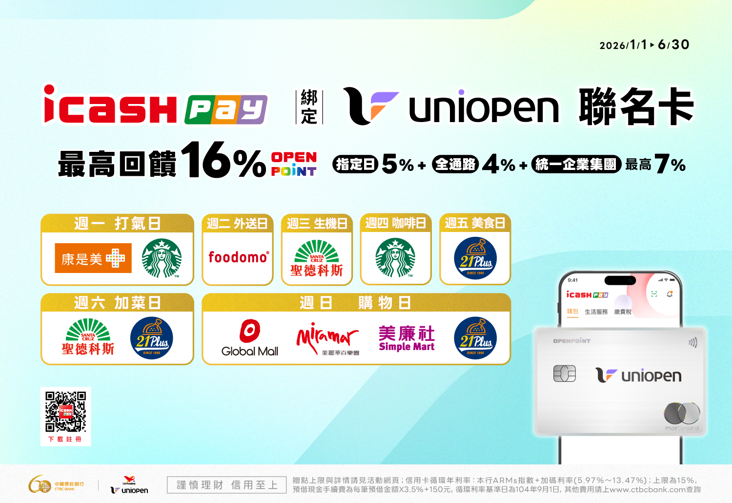 icash Pay綁定uniopen聯名卡 最高回饋16%