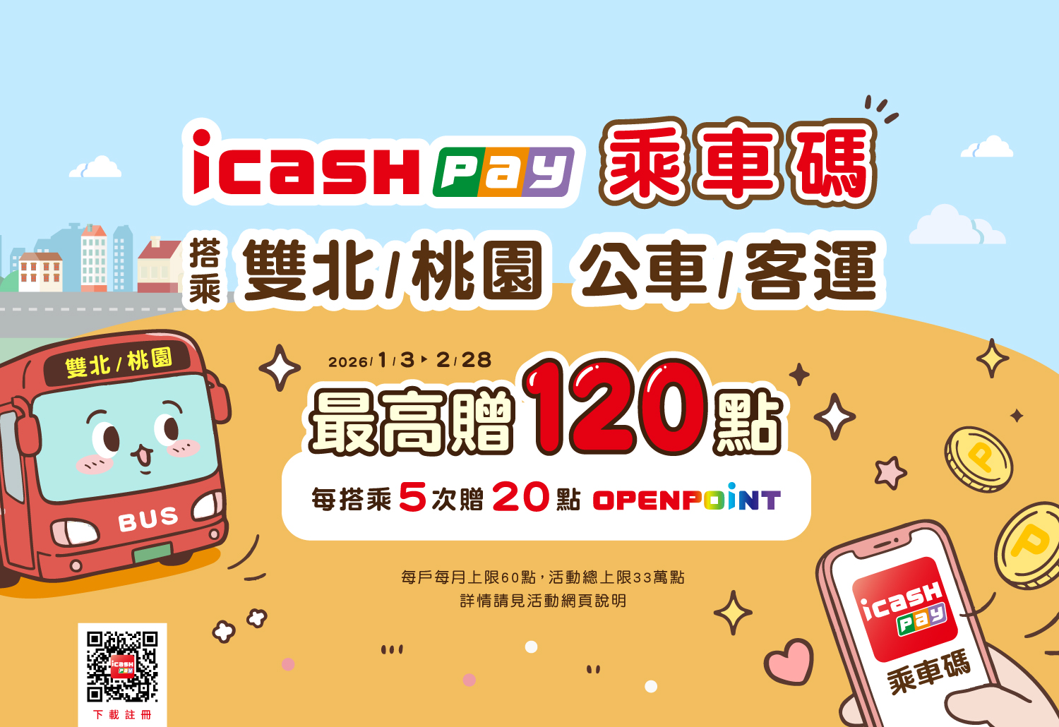 活動期間使用icash Pay乘車碼搭乘雙北/桃園地區客運公車,每搭乘5次贈20點OPENPOINT,每戶每月上限60點,活動總上限33萬點。