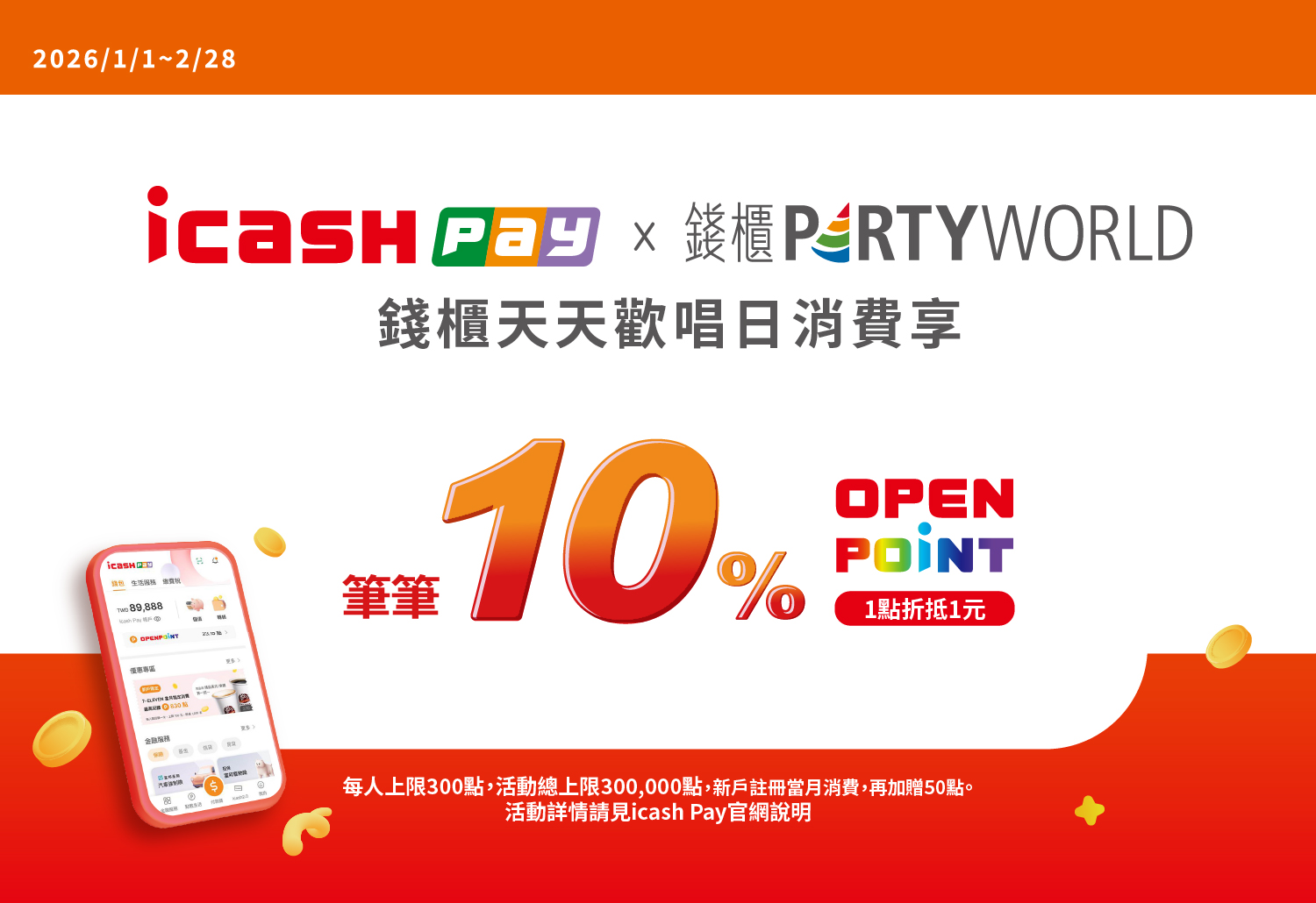 活動期間天天於錢櫃PARTWORLD門市使用icash Pay支付不限金額,筆筆享10% OPENPOINT回饋。活動期間每戶回饋上限300點OPENPOINT,活動期間總贈點上限30萬點OPENPOINT。