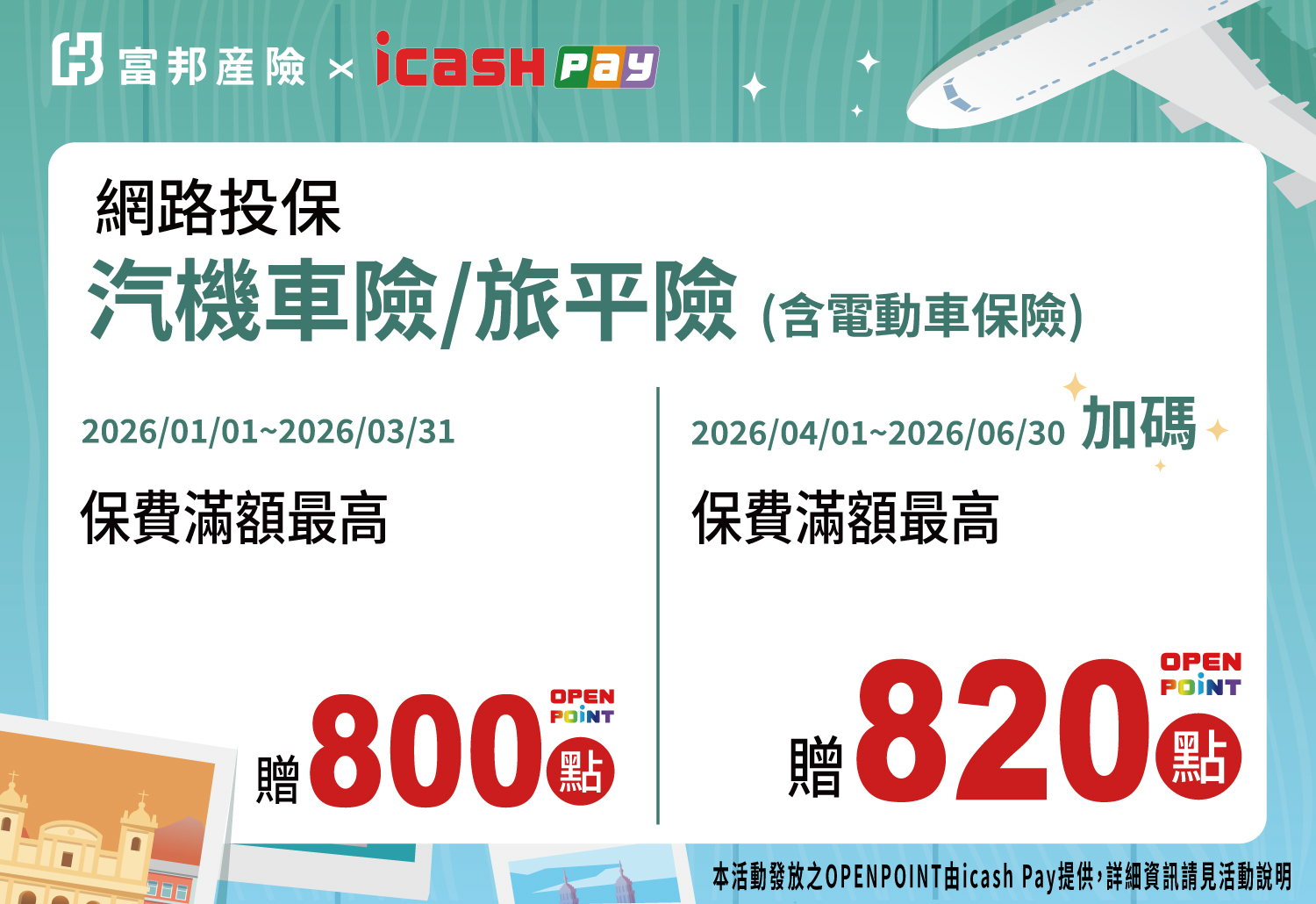 icash Pay網路投保富邦產險指定險種 最高回饋800點 (2026/4/1起最高回饋820點)