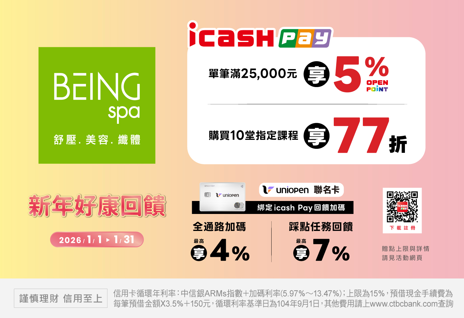 活動期間持icash Pay至全台BEING spa門市單筆消費滿25,000元(含)以上,享交易金額之5% OPENPOINT回饋,每戶贈點上限4,500點,活動總贈點上限15萬點。購買10堂指定課程再享77折優惠。