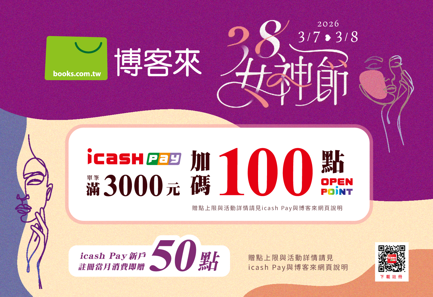 活動期間不限新舊戶,於博客來以icash Pay支付消費單筆消費滿3,000元,即可享100點OPENPOINT點數回饋,單筆可累贈,每戶活動期間回饋上限800點。活動期間總回饋上限30萬點。