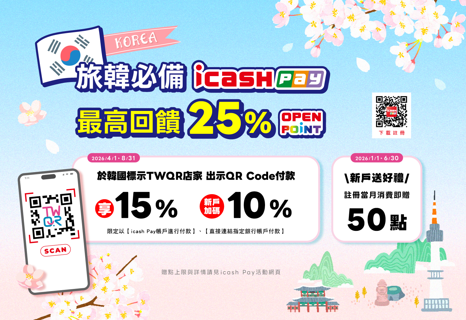 活動期間於韓國標示TWQR店家,使用icash Pay出示條碼付款,享支付金額筆筆15% OPENPOINT回饋,活動期間每月每戶最高上限300點,總點數上限50萬點。