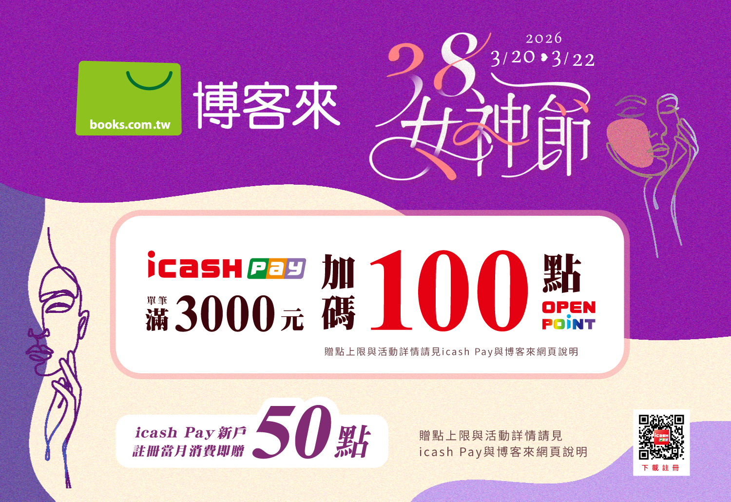 活動方式:活動期間不限新舊戶,於博客來以icash Pay支付消費單筆消費滿3,000元,即可享100點OPENPOINT點數回饋,單筆可累贈,每戶活動期間回饋上限300點。活動期間總回饋上限10萬點。