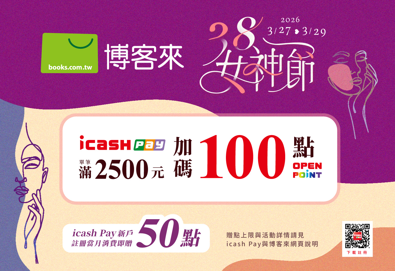 活動期間內首次註冊icash Pay之新用戶,註冊當月使用icash Pay不限金額消費,即贈50點OPENPOINT。每戶限回饋乙次,活動總上限400萬點。活動詳情。