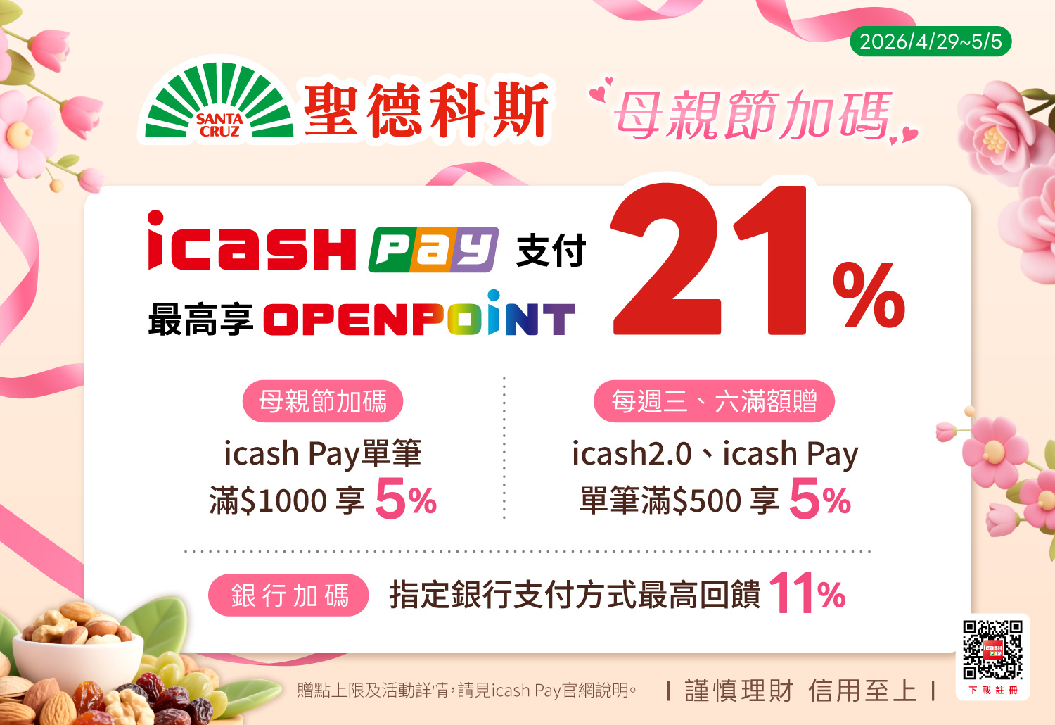 聖德科斯母親節加碼 icash Pay疊加銀行活動最高享21%