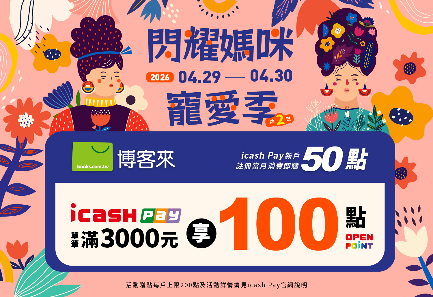 活動期間不限新舊戶,於博客來以icash Pay支付消費單筆消費滿3,000元,即可享100點OPENPOINT點數回饋,單筆可累贈,每戶活動期間回饋上限200點。活動期間總回饋上限10萬點。