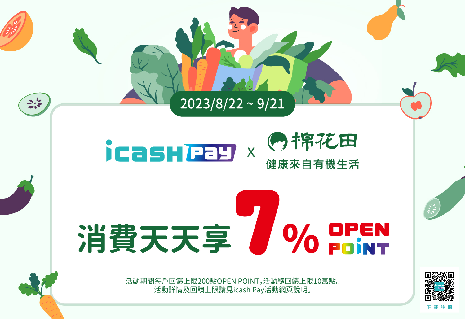 活動期間持icash Pay於棉花田生機園地消費即享交易金額之7% OPEN POINT回饋,活動期間每戶回饋上限200點OPEN POINT,活動總回饋上限10萬點OPEN POINT,活動回饋點數將於付款成功後即時入點,最晚於次月底前匯入icash Pay所綁定的OPEN POINT會員帳戶中。